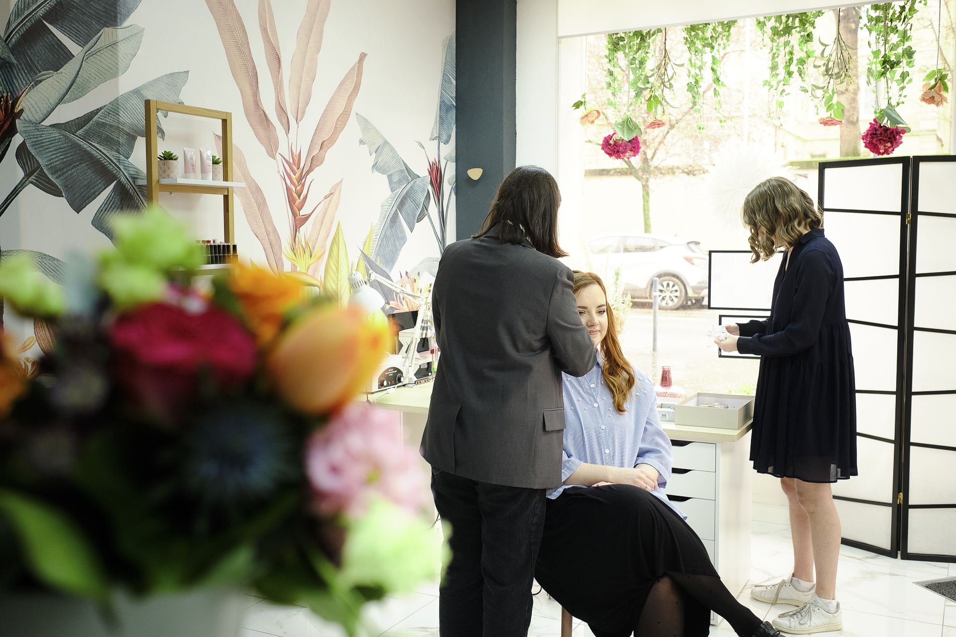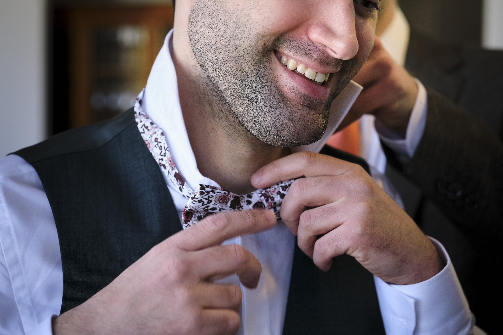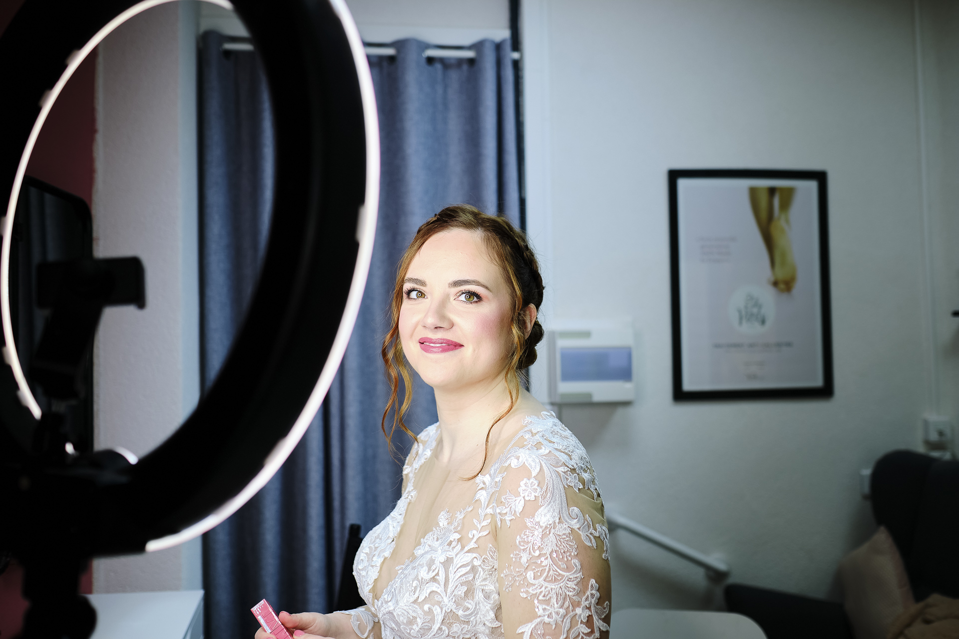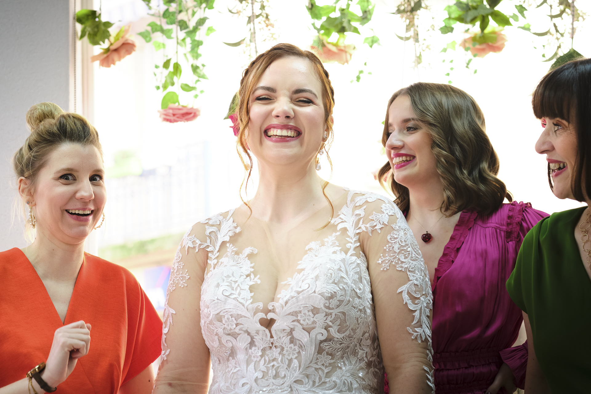 La journée a débuté en douceur avec les préparatifs de la mariée, chez elle. Maquilleuse de profession, elle a pris soin d’elle-même, parfaite pour son grand jour. Après avoir appliqué les dernières touches de maquillage, elle s’est rendue à son institut de beauté, où une coiffeuse professionnelle s’est déplacée pour sublimer sa chevelure. Entourée de sa mère, de ses proches et de ses demoiselles d’honneur, elle a été chouchoutée dans une ambiance chaleureuse et joyeuse, et chaque instant a été immortalisé à travers mes photos et vidéos.