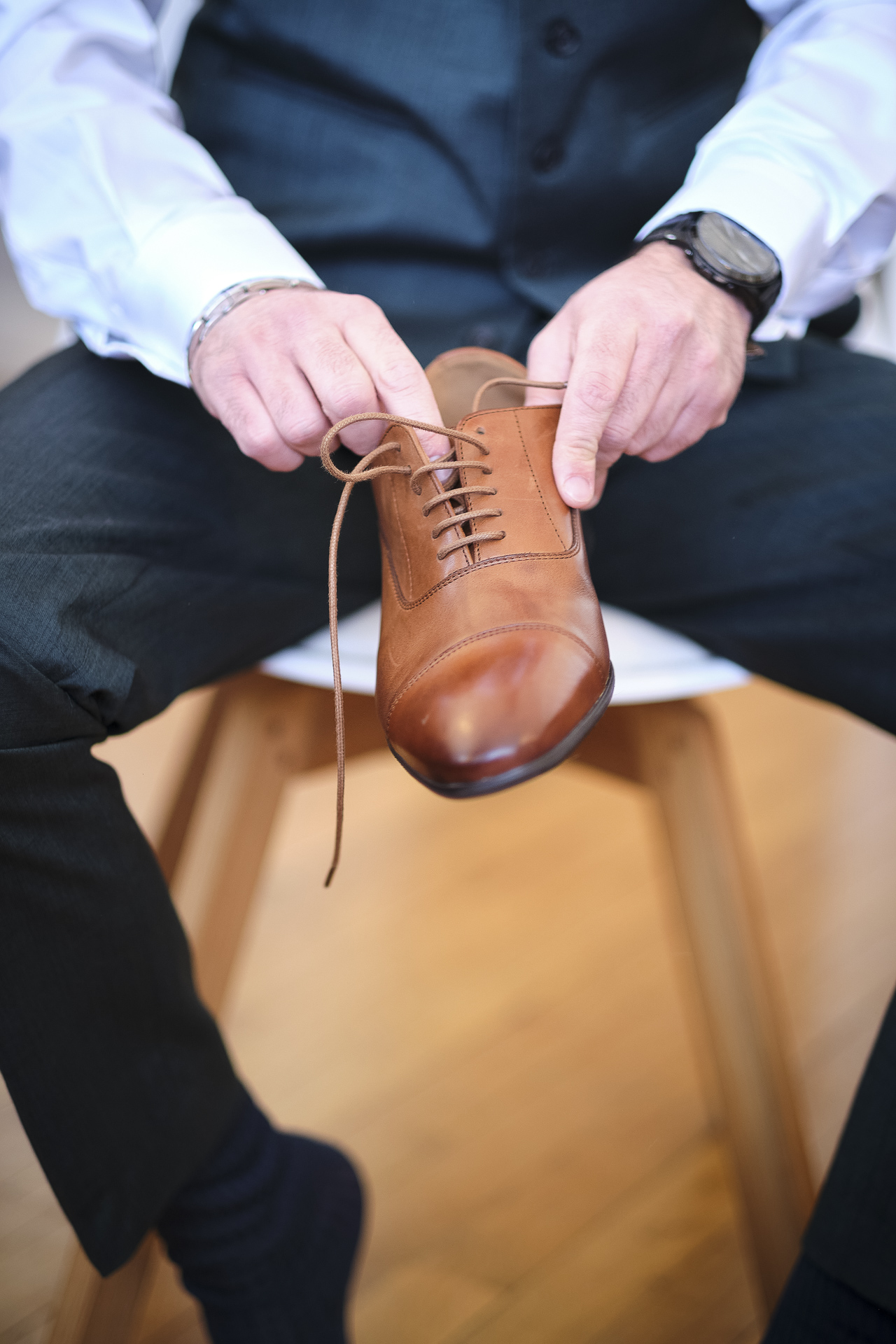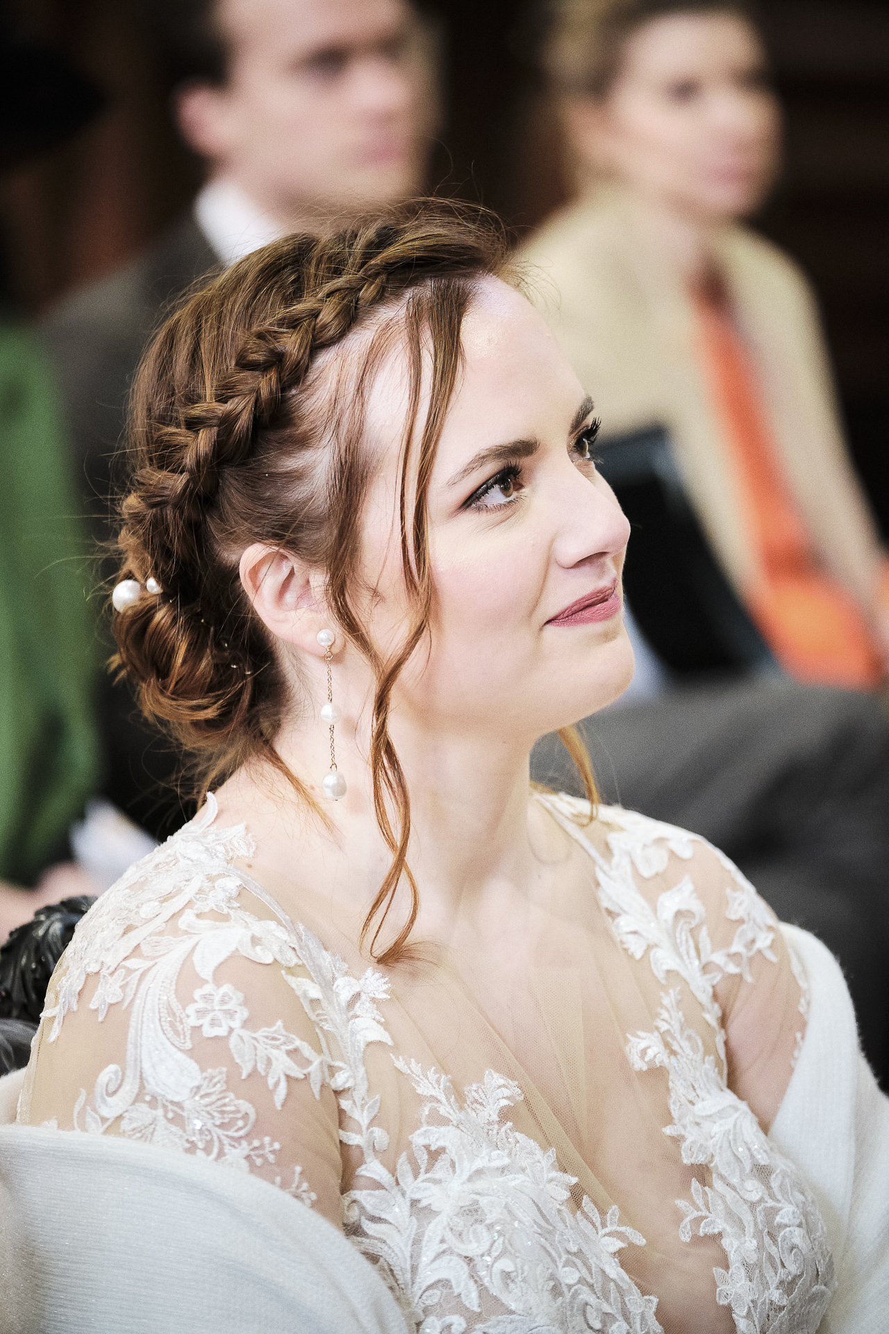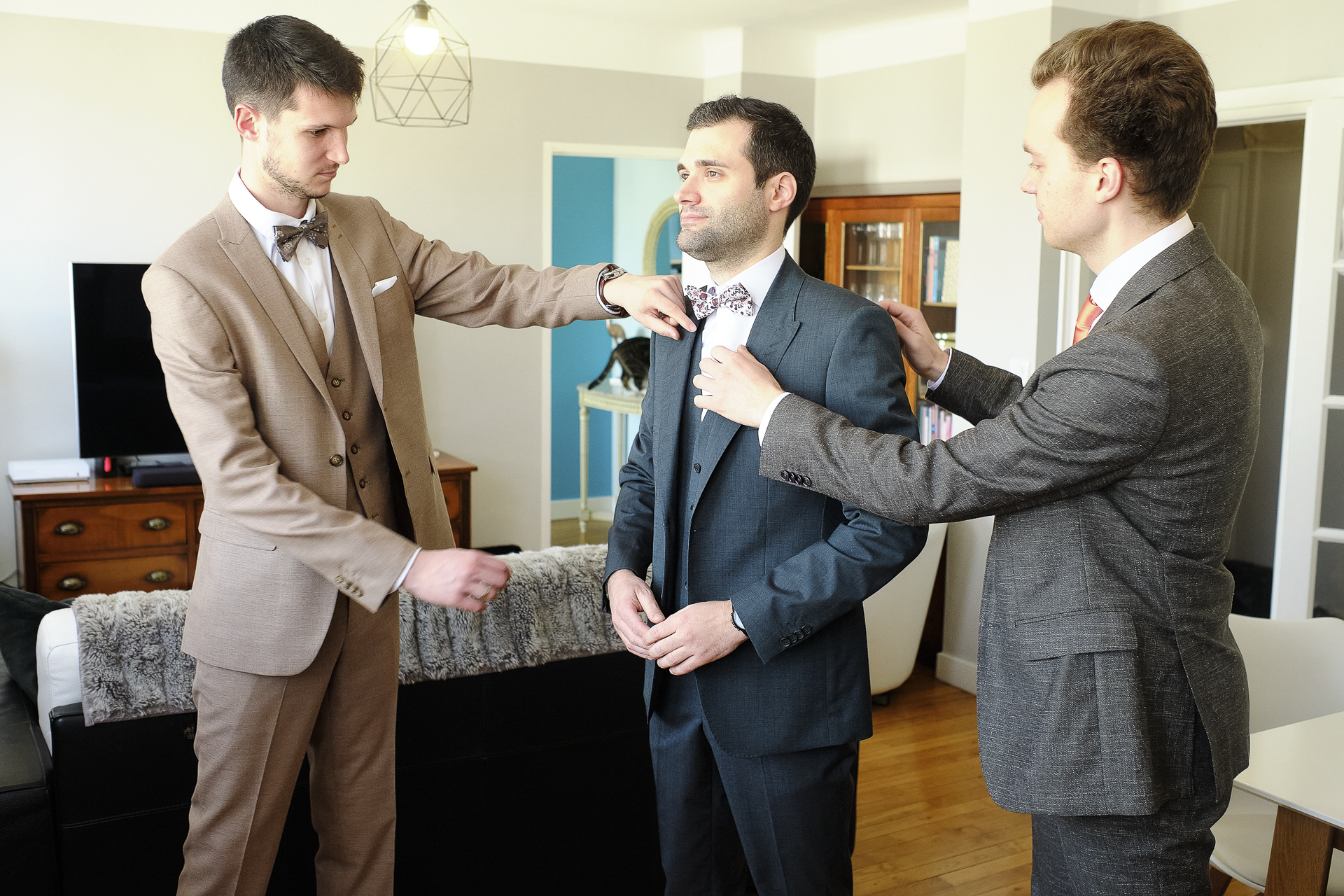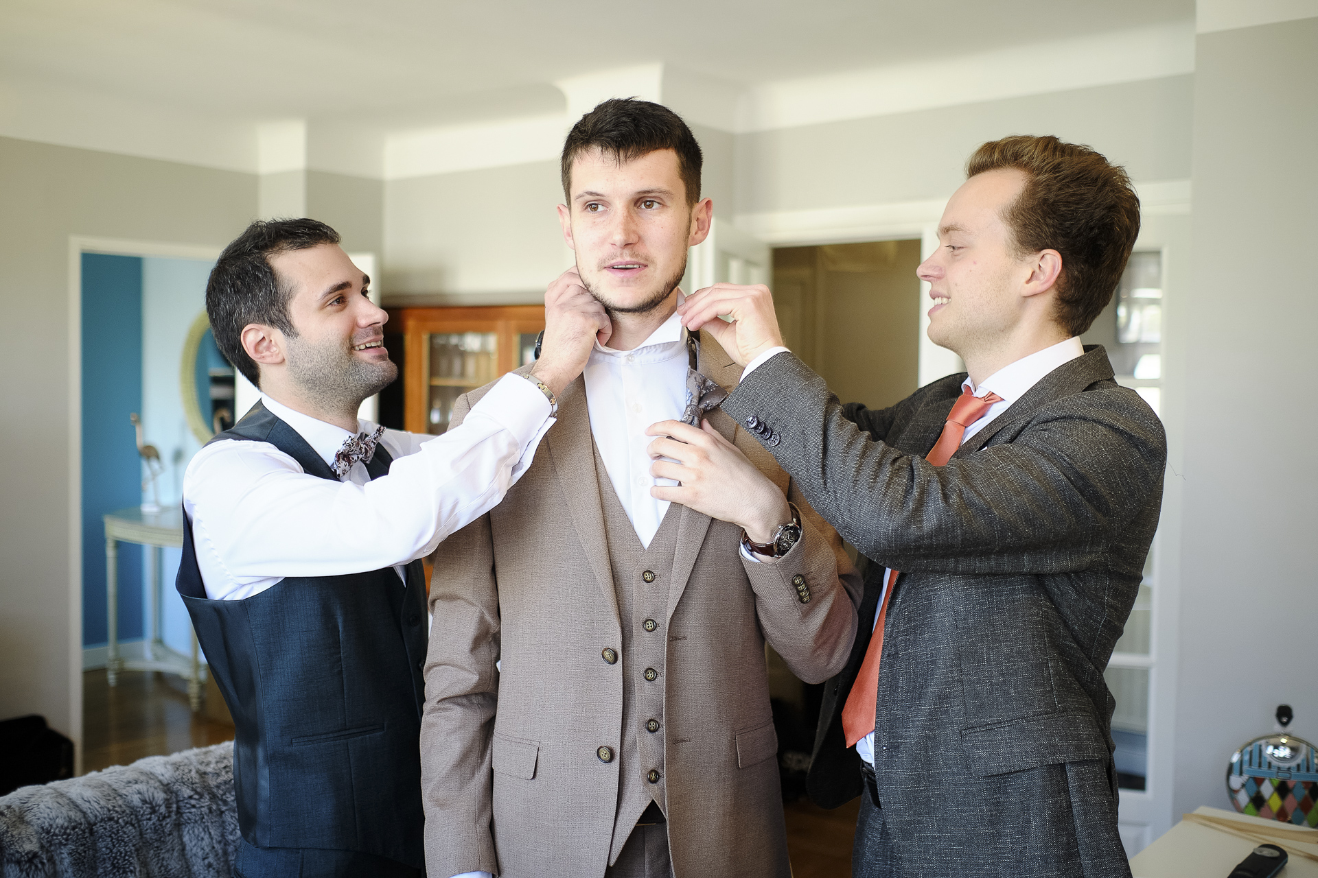 Pendant ce temps, je me suis rendu chez le marié, dans son domicile, où il se préparait avec ses damoiseaux. L’ambiance était décontractée, pleine de rires et de complicité. Une fois les préparatifs de Monsieur terminés, nous avons repris la route pour l’Institut de la mariée, où elle a enfilé sa robe blanche brodée, un chef-d’œuvre de dentelle et de détails délicats. C’était un moment d’émotion, avec ses proches qui l’entouraient pour ce dernier moment avant la cérémonie.