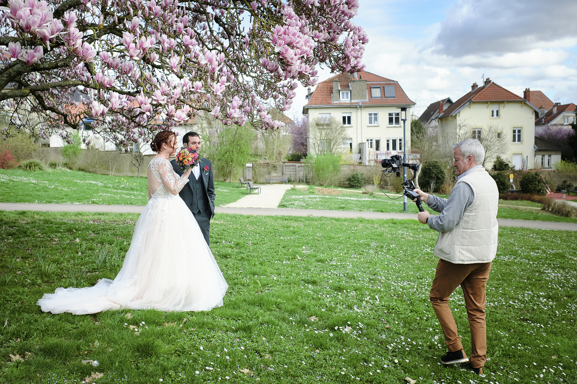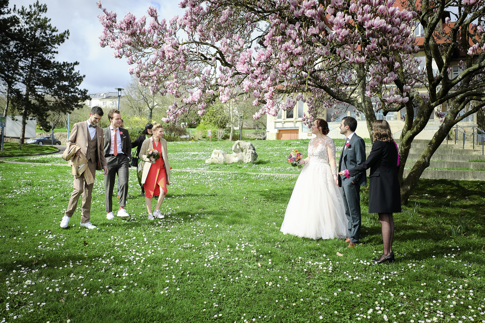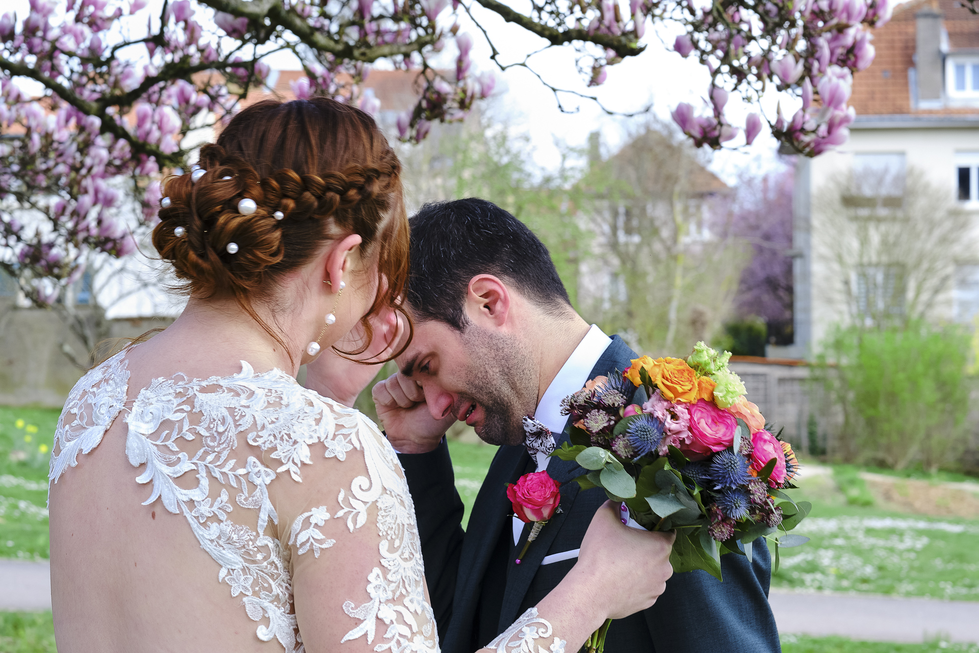 Le couple a choisi de vivre un moment intimiste avant la cérémonie : le « premier regard ». Dans le parc de la mairie de Laxou, sous un soleil éclatant et un ciel bleu parfait, les arbres en fleurs créaient un décor féerique. La mariée, bouquet à la main, s’est approchée discrètement de son futur époux, qui attendait, le dos tourné. Lorsqu’il s’est retourné et l’a vue dans sa robe, un instant d’émotion pure s’est produit. Un éclat de joie et des larmes ont illuminé leurs visages, un souvenir inoubliable capturé par l’objectif.