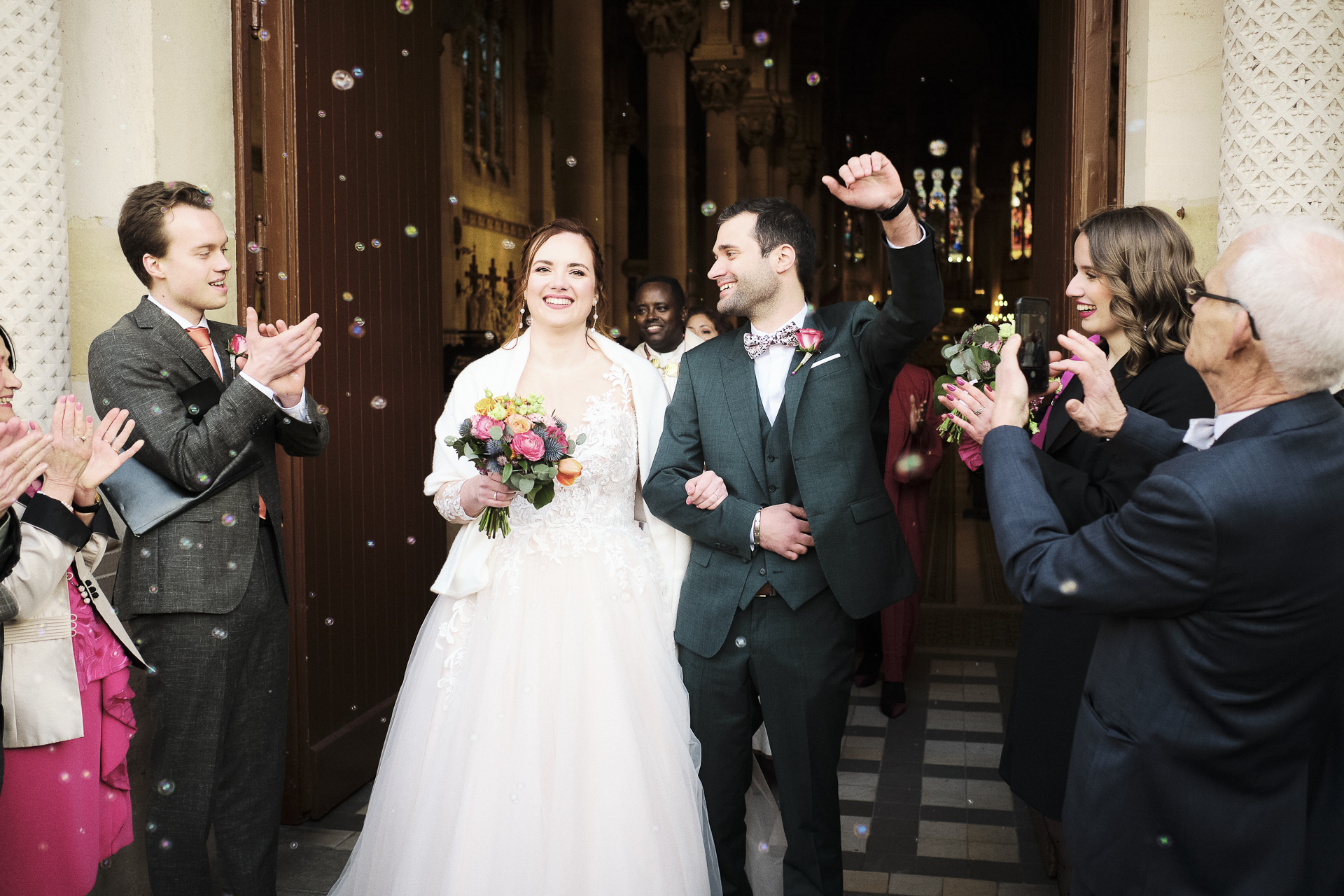 Ensuite, le couple s’est dirigé vers la Basilique du Sacré-Cœur pour la cérémonie religieuse. Dans une atmosphère solennelle, les invités se sont installés, impatients de voir les mariés échanger leurs vœux devant Dieu. La cérémonie était magnifiquement rythmée, entre chants religieux, discours émouvants et échanges de regards sincères. À la sortie de l’église, les invités ont lancé des pétales de fleurs pour célébrer leur union dans la joie et la lumière.