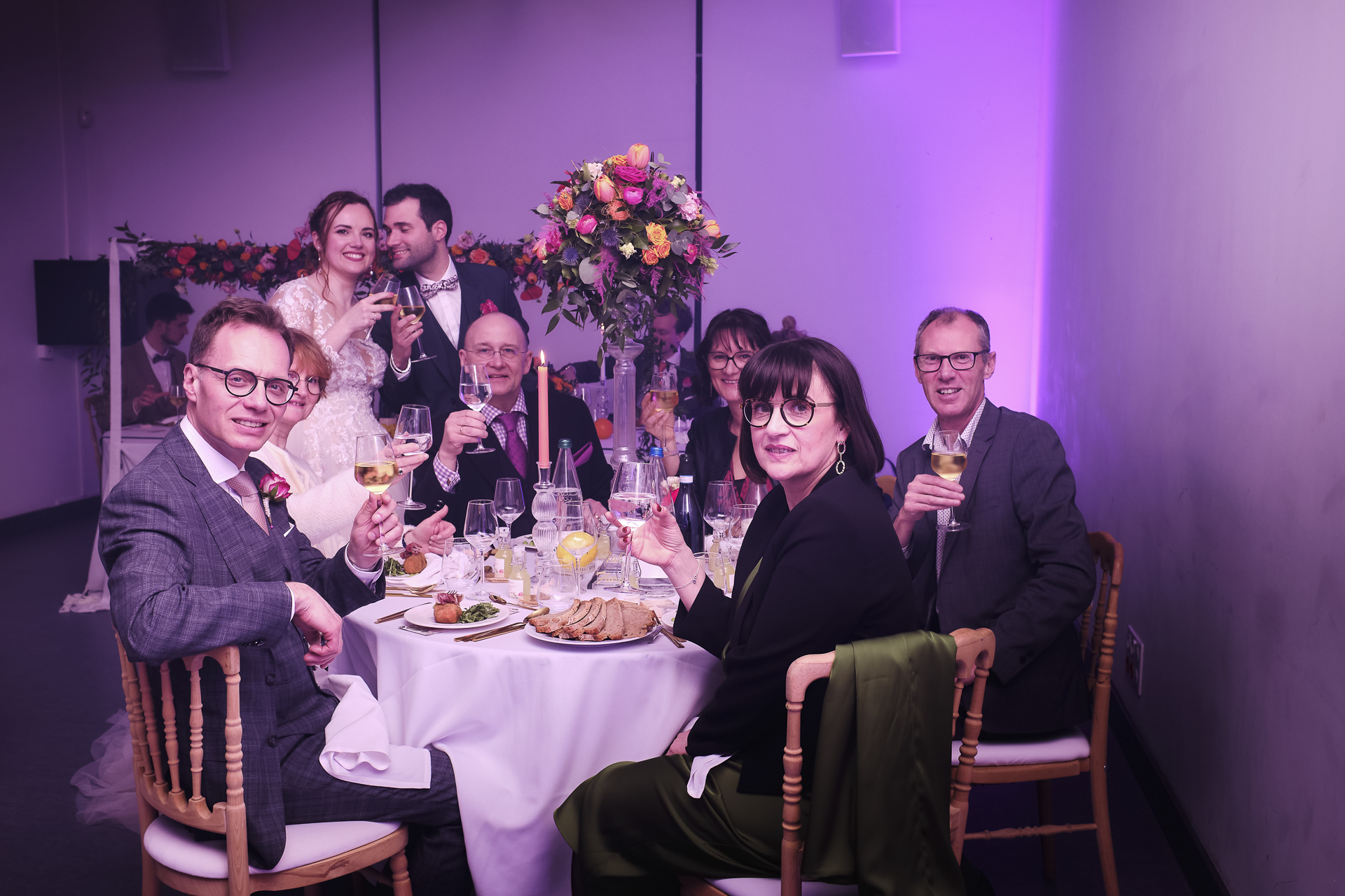 À 20h00, nous avons descendu les escaliers du château pour rejoindre la salle où se déroulaient les festivités. La décoration, les tables et l’ambiance étaient parfaites pour un dîner mémorable. Rires, émotions, discours touchants et jeux ont animé la soirée. Les invités étaient captivés par l’ouverture du bal des mariés, un moment magique où ils ont dansé ensemble sous les projecteurs. Le gâteau des mariés a été un véritable chef-d’œuvre, apprécié de tous, avant que la piste de danse ne se remplisse de joyeuses rires et de pas de danse. La soirée s’est prolongée jusqu’au bout de la nuit, avec une ambiance festive, des éclats de rires et des moments émouvants.